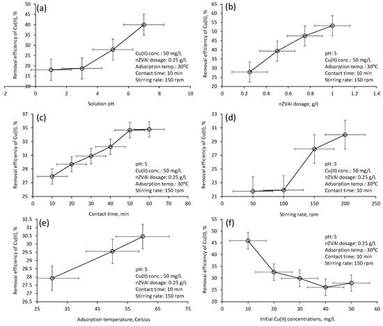 Influences of operational factors on the Cu(II) removal efficiency by nZVAl (a) solution pH, (b) nZVAl dosage, (c) contact time, (d) stirring rate, (e) adsorption temperature, (f) initial Cu(II) concentration.