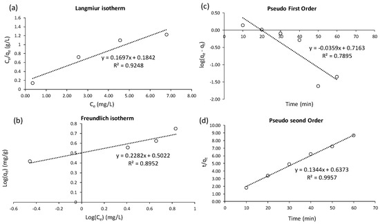 Fitting of adsorption data to (a) isotherm Langmuir model, (b) isotherm Freundlich model, (c) PFO kinetic model, and (d) PSO kinetic model.