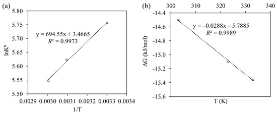 To determine the thermodynamic properties of Cu(II) adsorption onto nZVAl at various temperatures, Van’t Hoff and Gibbs-Helmholtz models were employed at different temperatures of 303, 323, and 333 K. Gibbs free energy (ΔG°), enthalpy (ΔH°), and entropy change in adsorption (ΔS°) are presented by the following Equations (23)–(26) [62]: