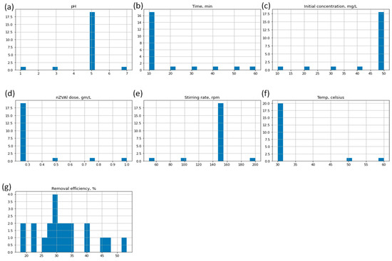 Histogram of input data features (a) pH, (b) time, (c) Co, (d) nZVAl dose, (e) stirring rate, (f) temperature, and the output variable (g) removal efficiency. The y-axis represents frequency (counts) and x-axis denotes the number of bins for each factor.