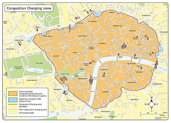 - London Congestion Charge: Why It’s Time to Reconsider One of the City’s Great Successes. 2 March 2018. Available online: https://theconversation.com/london-congestion-charge-why-its-time-to-reconsider-one-of-the-citys-great-successes-92478 (accessed on 20 July 2021).