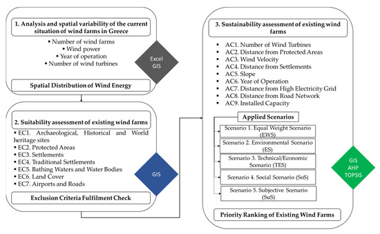 Methodological framework for suitability and sustainability assessment of existing wind farms in Greece.