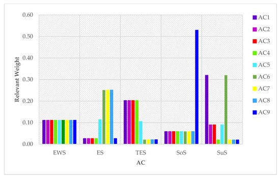 From Figure 2, it can be seen that the relative weights of assessment criteria strongly depend on the scenario performed. For example, in the alternative scenario TES, the criteria with technical-economic aspects, i.e., criteria that are related to functionality, energy efficiency, and minimization of the financial costs of the wind installation, such as Wind Velocity (AC1), Distance from High Electricity Grid (AC2), Slope (AC3), and Distance from Road Network (AC4), present the most important assessment criteria for determining the sustainability of the existing wind farms. In addition, a high weight is attributed to Installed Capacity (AC5), as it is an assessment criterion with a partially financial nature, which guarantees the shortest payback period of the project.