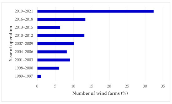 The year of wind farm operation is selected as an environmental criterion as it provides useful information for wind farm installation (e.g., [53,55]). Firstly, the more recent the year of operation is, the higher the possibility is of including recent advances and technological trends for wind turbines. At the same time, wind farms with a short operation life cycle present increased capability of contributing to the energy mix for at least the next 20 years (life cycle of the project) and therefore promote sustainable development. In addition, this assessment criterion could identify projects that are at the end of their lifetime and therefore their sites should be reassessed for future wind farm installations. To the authors’ knowledge, this is the first time that this criterion has been used in a wind farm siting decision making process.