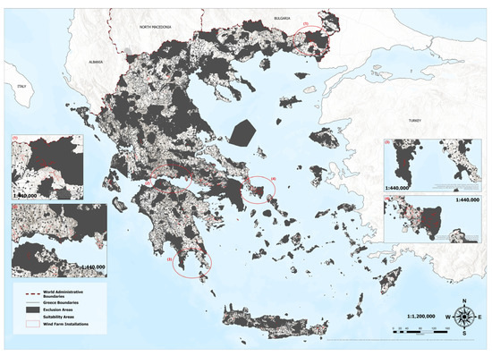 The second stage entails the suitability assessment of the existing wind farms. A GIS database is created that generates individual thematic maps indicating a set of seven exclusion criteria. The exclusion criteria are those that have an impact on the study area because they make it impossible for a wind farm to be deployed in a particular location due to forecasted environmental zones, uses that are incompatible with other forms of economic activity, or protection rules. The exclusion criteria in this study are mainly retrieved from the SFSPSD-RES [23] and are related to environmental as well as technological and social constraints. Unsuitable zones are found by superimposing the aforementioned maps, and the percentage of the existing wind farms that fail to satisfy the above restrictions is calculated.