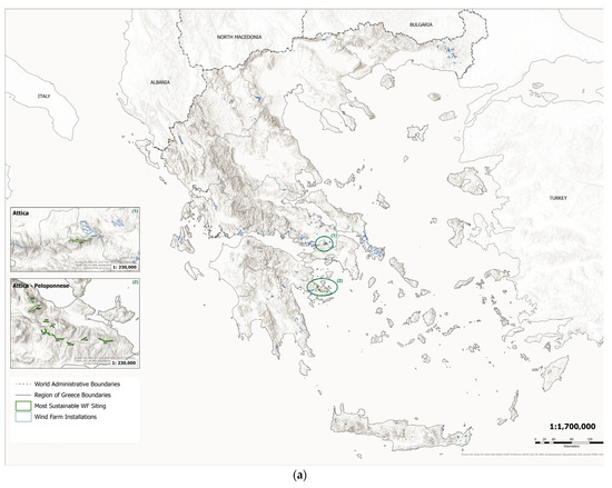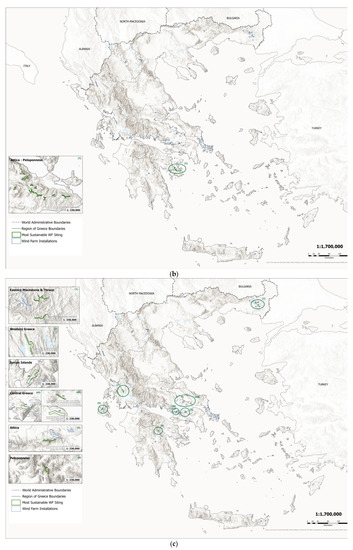 The Social Scenario (SoS) concerns a more social approach, aiming at the reduction in land conflicts (wind farm–settlement), social reactions, and tensions in local communities. The appearance of the “not in my backyard” (NIMBY) phenomenon is common in cases in which the question of wind farm siting arises [69,70] and specific wind energy projects encounter local opposition. Although people support wind energy, individual wind farms can have undesirable characteristics, such as visual and noise effects. Ideal areas for wind farm siting are considered those that are far enough from settlements (e.g., 8 km, 7.5 km, 6 km, 3 km), and at the same time present satisfactory values in the other assessment criteria (usually not having positive or negative extremes). The aforementioned wind farms are mainly sited in the AR of Eastern Macedonia and Thrace, Central Greece, Peloponnese, and Attica (Figure 6d).