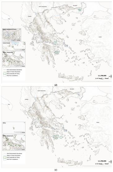Continuing with the Technical/Economic Scenario (TES), the most ideal wind farms are characterized as those located in sites with high wind velocity, at a fairly close distance from the high electricity grid and the road network, in sites with a low slope, and present a high installment capacity. Figure 6c depicts the ten ideal existing wind farms that are spread in almost 50% of the AR of the country (Central Greece, Eastern Macedonia, and Thrace, Peloponnese, Attica, Ionian Islands, and Western Greece).