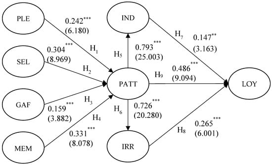 According to the path of relationships among variables in Figure 1, we build Table 7. Further calculation showed that the influence values of PATT, IND, and IRR as mediating variables were 0.8207, 0.1207, and 0.1994, respectively. Therefore, PATT was the primary mediating variable; PATT’s effect on LOY was the most obvious.