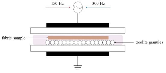 Raw jute fabric was treated with plasma obtained by dielectric barrier discharge (DBD) in open air at atmospheric pressure (Figure 1) [30]. The discharge was generated between two plane-parallel electrodes (8 cm × 20 cm) covered by a 0.7 mm thick alumina sheet (10 cm × 22 cm). An upper electrode was set at AC high voltage, while the lower electrode was connected to the ground through a 14 kOhm capacitor. The voltage applied to the electrodes was measured using a high-voltage Tektronix P6015A (Tektronix, China). The low-frequency AC power supply used in this study consists of a high-voltage transformer and a frequency inverter (Emerson Commander SKA 1200075AC variable-speed drive), which allows for variation of the sinusoidal voltage amplitude and frequency. The distance between the electrodes was fixed by glass space holders to ensure a fixed discharge gap of 3 mm. Granules of zeolite were used during the plasma treatment of fabrics in order to avoid the problem of humidity and to maintain a homogeneous discharge [36]. Raw jute fabric (labeled as J) with dimensions of 20 cm × 8 cm (in the warp direction) was treated under two different regimes of discharge. The first regime involves the use of the following parameters: 150 Hz, 15.2 kV, 120 s (fabric marked as J150); in the case of the second regime, the parameters were set as follows: 300 Hz, 12.6 kV, 120 s (fabric denoted as J300). The plasma treatment conditions were chosen with the intention of determining which parameter has a decisive influence on fabric treatment: the applied energy (35% higher for 300 Hz frequency) or the applied voltage (20% higher for 150 Hz frequency).