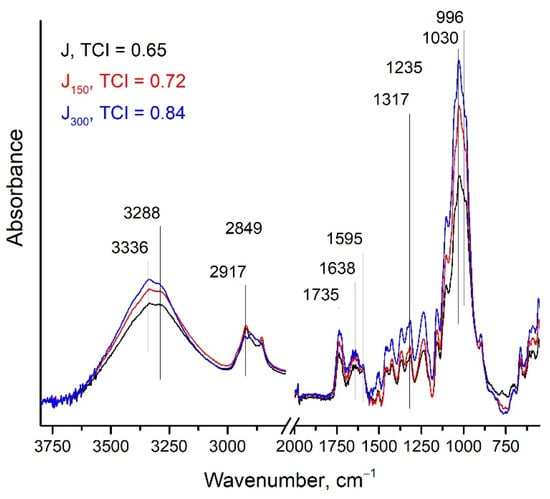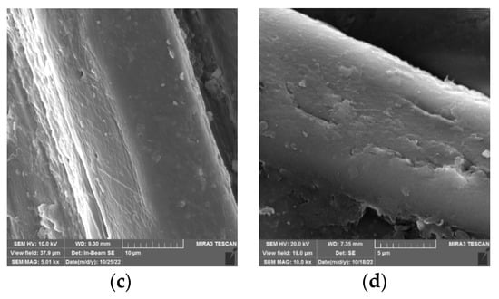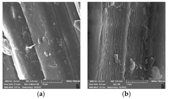 As previously mentioned, raw jute consists of cellulose, hemicelluloses, lignin, and some minor components distributed in the complex layered fiber structure covered by surface impurities. After the plasma treatments, the intensities and positions of the bands at 2917 and 2849 cm−1 (assigned to C–H stretching vibration of CH2 and CH groups in cellulose and hemicelluloses [37]) changed, indicating that some jute surface impurities (such as waxes, and bit-shaped pectin [38]) were removed. This statement is additionally supported by the FE-SEM microphotographs (Figure 3); due to surface ablation, only a small amount of impurities can be observed on the J300 fiber surface.
