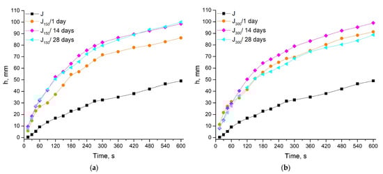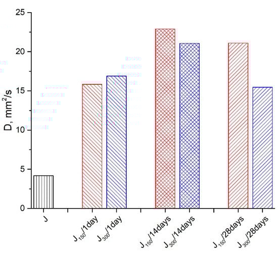 An aging effect often occurs after plasma treatments, as manifested by changes in the activated fiber surface over time or by reversal of achieved effects through the recombination of functional groups on the fiber surface [23]. Therefore, special attention was paid to the h of plasma-treated fabrics aged for 1, 14, and 28 days. Interestingly, the results presented in Figure 7a indicate that the aging of plasma-treated fabrics led to an improvement in their h values. In particular fabrics aged for 14 and 28 days (J150/14 days and J150/28 days, respectively) had about 16% higher h values than the fabric aged for 1 day (J150/1 day). The situation is somewhat different in the case of fabric treated at a frequency of 300 Hz (Figure 7b). It is evident that after 14 days of aging, the h of fabric J300/14 days slightly improved (about 8%), and after 28 days of aging, returned to the initial value. Kramar et al. [48] identified the same phenomenon with respect to the capillarity of plasma-treated viscose fabric, which increased up to 14 days of aging. As illustrated in Figure 6, both J150/14 days and J150/28 days fabrics showed higher diffusion coefficients than J150/1 day, while in the case of fabrics treated at a frequency of 300 Hz, the highest diffusion coefficient was registered after 14 days of aging, followed by a significant decrease, i.e., after 28 days of aging, the diffusion coefficient decreased and was lower than that of J300/1 day.