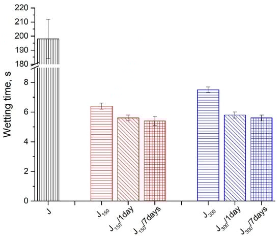 The wettability of the studied jute fabrics was further evaluated by determining wetting time (Figure 8). Surprisingly, immediately after the plasma treatment, about 31 and 26 times lower wetting times were recorded for fabrics J150 and J300, respectively. Such changes are undoubtedly related to the surface polarity (i.e., formation of new surface functional groups) and morphology (i.e., etching and roughness), which, together, promote quick and easy penetration and adsorption of water drop within the fabric. According to Dimic Misic et al. [49], the surface roughness increases the effective wetting area; water fills the roughened surface, making contact with the entire surface. On the other hand, the authors of [26] proposed that the removal of the waxy and pectin layer from the outermost jute fiber surface through atmospheric plasma in air improves the wetting properties of the fabric.