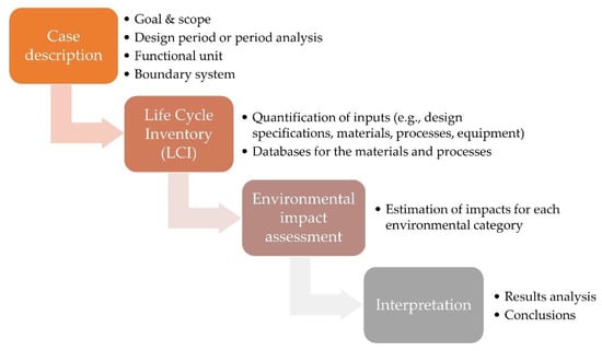 “Case description” describes the framework of this study: case study, planning period, functional unit, and boundary system. “LCI” selects the data used for the current LCA: LCA program, design specifications, materials, processes, and databases, e.g., on material properties, paving process, and equipment. Quantities are then estimated for each impact category. The impact categories analyzed in this study are energy and water consumption, gas emissions (CO2, CO), SO2, and NOX, which are responsible for acidification and eutrophication, respectively. Particulate matter with an aerodynamic diameter of less than 10 mm (PM-10), hazardous wastes, and carcinogenic and non-carcinogenic HTPs that are harmful to human health are also included in the impact categories. The results are then analyzed and the final conclusions are drawn.
