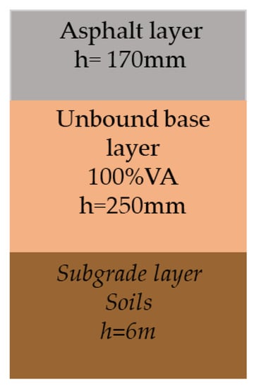 The functional unit is a length of one kilometer of the highway under study. It is a four-lane segment, two lanes per direction with a width of 3.50 m, and shoulders with a width of 2.30 m each. The existing pavement section comprises a 170 mm asphalt layer and a 250 mm unbound layer (base/subbase) in both directions and it is shown in Figure 2.