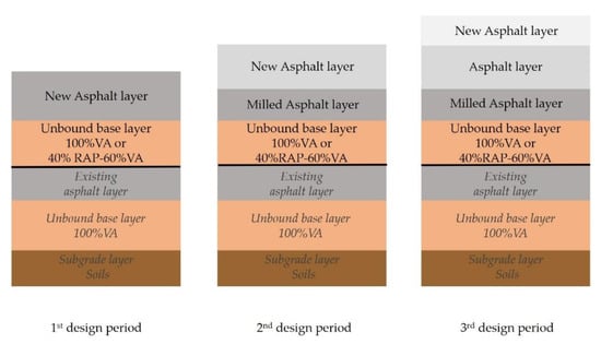 As mentioned above, the centerline of the road will be raised by 130 mm as part of the rehabilitation project to upgrade the pavement. For this purpose, the existing asphalt layer will be milled off at a certain depth and new pavement layers will be constructed above the milled asphalt layer. These new pavement layers are asphalt layers and an unbound layer (base/subbase), while the layers of the existing pavement are considered as the pavement subgrade. Based on this, two scenarios are considered as alternative solutions for pavement rehabilitation, including milling and construction of new pavement layers to achieve the project goal of raising the road centerline. The milling depth depends on the degree of damage to the existing asphalt layer, as does the thickness of the new layers relative to the required bearing capacity of the rehabilitated pavement. In the first scenario, the milling depth is 120 mm. The unbound layer has a thickness of 100 mm and the asphalt layers have a total thickness of 150 mm. In the second scenario, the milling depth is 100 mm. The unbound layer has a thickness of 100 mm and the asphalt layers have a total thickness of 130 mm. In this case, the milled asphalt (RAP) is used for the construction of the unbound layer of the added pavement and its proportion is thought to be 40% along with 60% of VA, while the asphalt layers are made of conventional materials. Finally, two periods of future maintenance and rehabilitation works are considered for both alternatives. In the 2nd design period, the asphalt layers are milled to a depth of 100 mm and new asphalt layers are constructed. Their thicknesses are 100 mm for each scenario. In the 3rd design period, the construction of a new surface layer with a thickness of 30 mm is considered.