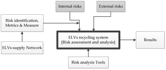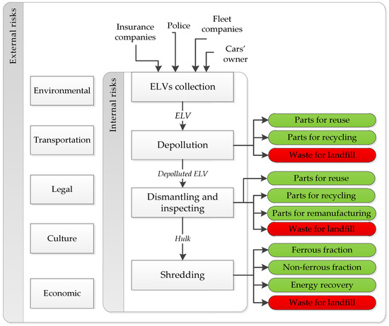 Each reprocessing activity is influenced by both internal and external risks worth noting [16]. ELV collection, manual sorting, dismantling, inspection, testing, and thermomechanical processes are characterized by internal risks associated with planning and forecasting, procurement, manufacturing, transportation, inventory management, distribution and warehousing, finance, management, and customer service. When ELVs are collected and received at the reprocessing center, all the liquids (motor oil, brake oil, refrigerant) as well as hazardous material pollutants, including mercury, cadmium, chromium, zinc, etc., which could be discharged to the environment and contaminate the natural resources to a greater extent [16], constitute external risks. The proper management of ELVs is an important part of sustainable transport concepts [2,4,17].