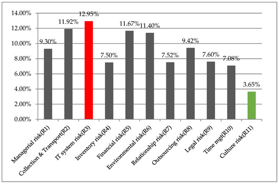 With reference to Figure 5, it can be observed that IT systems risk (in red) has the highest rating (0.936) which can impose a considerable impact on overall ELV recycling. Moreover, its percentage of contribution is about 12.95% of the overall ELV performance risk. The inability to fulfill reprocessing activities due to incorrect/insufficient ELV data as well as a lack of updated ELV information in the database or data loss concerning the particular ELV material has considerable implications on estimating the status and availability of ELV waste for proper planning and control of the ELV supply chain. Therefore, there is a need for companies to invest in efficient ELV IT systems. On the other hand, culture risk (green) possesses the lowest risk in the ELV recycling supply chain with a 3.65% contribution. Therefore, it has no serious implications for the efficiency of the ELV supply chain. As a consequence, it can be seen that the risk with a high contribution value is a major source that requires the management of its influencing factors.
