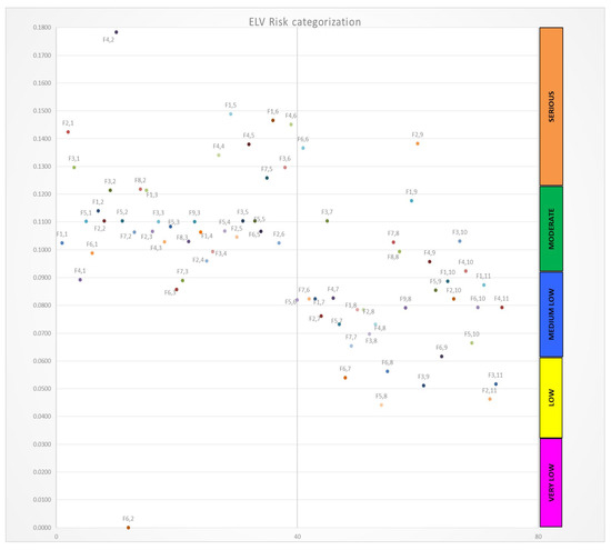 Furthermore, the study mapped all the ELV risk factors into five zones: Very Low, Low, Medium-Low, Moderate, Serious, and Critical (Figure 6). The risk mapping gives a graphical visualization of all crisps at a glance, indicating each risk level to enable a quick action plan by the risk management team leaders, risk owners, risk committee, decision team, etc., to identify and manage the risks successfully. The likelihood factor (L) multiplied by the impact factor (I), and the consequence of those two trapezoidal fuzzy numbers in terms of crisp scores, becomes the risk rating. Table 4 presents risk rating (crisp) values for the linguistic risk parametric scale with reference to Table 3.