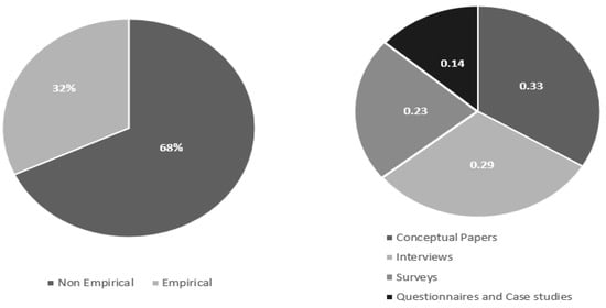 The methods used in the reviewed articles were varied, although conceptual papers constituted 32% of the overall reviews. Interviews constituted 29%; online surveys 21%; and online questionnaires and case studies 13%. In addition, 68% of the studies in the review adopt a non-empirical approach versus 32% that adopt the empirical approach, as shown in Figure 1.