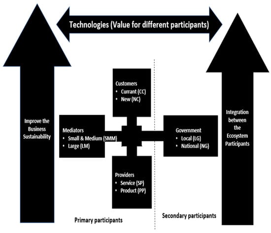 Many articles have also discussed SE-related topics, such as previously mentioned digital technologies in the SE ecosystem and how SE is presented and used through digital channels [13]. The debate around the participants in SE has led the researcher in this study to highlight the value of technology in participants’ integration and sustainability. Many studies have examined particular participants and analysed them. As a result, there has been an increase in the awareness and understanding of ecosystems; creating and capturing value through novel models was the focus of attention [14]. However, these studies do not understand the value of the participant’s role. For example, is each participant in the ecosystem playing the same role, or do they play primary and secondary roles within it? Accordingly, the research has two objectives. The first objective is to understand the value of technologies in integrating SE participants and their impact on business sustainability. The second objective is to clarify the role of the participants in the SE ecosystem by subdividing them into groups and developing a framework to explain the primary and secondary roles they play in each group.