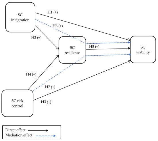 SC resilience is an essential construct that paves the way for a firm to achieve viability and better performance [24]. On the other hand, SC integration is required to achieve a resilient SC configuration [21]. Similarly, the practice of SC risk control enables the firm to attain SC resilience [51,52]. Thus, the above literature support motivates us not only to examine the direct effects of SC integration and SC risk control on SC viability, but also to analyze the mediating effects of SC resilience on the linkage between (i) SC integration and SC viability and (ii) SC risk control and SC viability. Thus, we develop the following hypotheses: