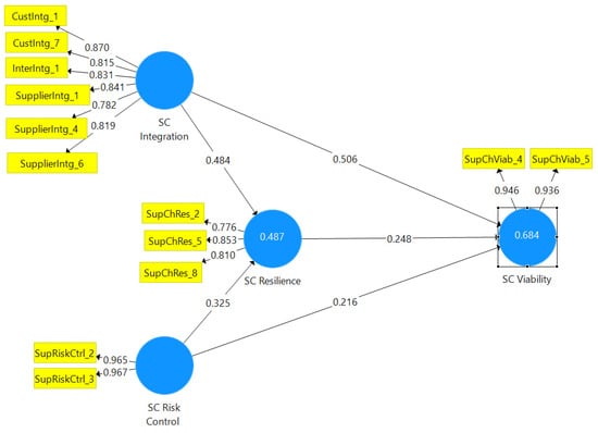 After the primary run of the PLS algorithm with the constructs and respective indicators, some indicators were discarded due to insufficient factor loadings (<0.70) [69] and inappropriate cross-loadings. The minimum number of indicators per construct in PLS-SEM can be 1 [70,71]. After the elimination of the indicators, the final model kept six indicators for SC integration, two indicators for SC risk control, three indicators for SC resilience, and two items for SC viability. The factor loadings, values of reliability, and validity are shown in Table 2. From Table 2, it is obvious that all constructs possess reliability and validity issues.