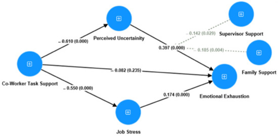 The study also elaborated on the mediating roles of perceived uncertainty and job stress between coworker task support and emotional exhaustion. Table 5 shows that perceived uncertainty significantly and negatively mediated the relationship between coworker task support and emotional exhaustion (beta = −0.242, t-value = 5.681, p-value = 0.000), and hypothesis H2 was accepted. The mediating relationship was full mediation because the direct effect was not significant. On the other hand, job stress also significantly and negatively mediated the relationship between coworker task support and emotional exhaustion (beta = −0.096, t-value = 3.360, p-value = 0.001), and hypothesis H3 was also accepted based on the full mediation testing.