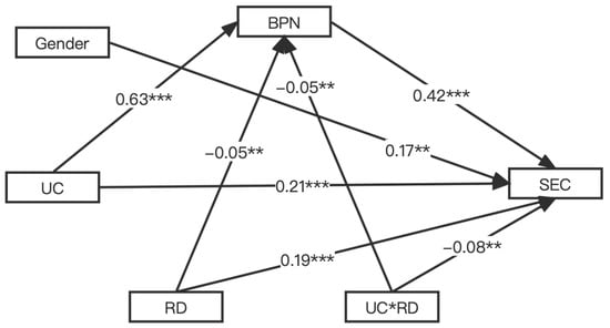 To test for moderated mediation, a structural equation model was constructed with UC as the independent variable, BPN as the mediating variable, RD as the mediator and SEC as the dependent variable. Specifically, BPN mediated the relationship between UC and SEC and UC affected SEC. RD moderated the path from UC to SEC and the path from UC to BPN. The results showed that the fit index of the model was ideal (RMSEA = 0.08, CFI = 0.93, TLI = 0.91, SRMR = 0.01). First, UC (β = 0.63, p < 0.001) and RD (β = −0.05, p < 0.01) showed significant effects on BPN and the interaction of UC and RD showed significant effects on BPN (β = −0.05, p < 0.01). Second, UC (β = 0.21, p < 0.001) and RD (β = 0.19, p < 0.001) showed significant effects on SEC, BPN showed significant effects on SEC (β = 0.42, p < 0.001) and the interaction of UC and RD showed significant effects on SEC (β = −0.08, p < 0.01). The results are displayed in Figure 1.