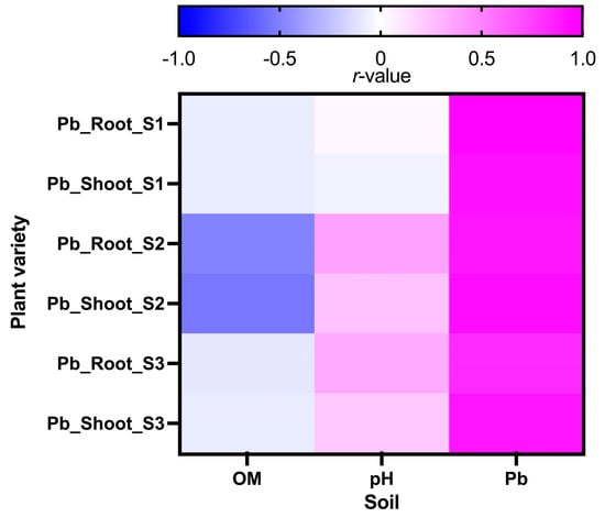 The Pearson correlation analysis is shown in Figure 1 and Supplementary Material S1. The solubility of PTEs is controlled by the adsorption and desorption phenomena in soil, which are primarily influenced by soil characteristics, i.e., pH, OM, CEC, Eh and the concentration of specific PTEs ion [33]. The obtained results showed that Pb concentrations in the growing sorghum cultivars were strongly linked to the Pb concentrations in soils where they were grown. These findings imply that Pb can be easily transferred from soils to plants. The previous studies went almost to similar findings [87]. They have mentioned that, as the concentration of PTEs increased in soil, the growing plants’ uptake increased. Sorghum cultivar S1 showed a negative correlation between soil pH and plant Pb absorption. The average pH value of the examined soil was 7.59, and raising soil pH resulted in less Pb ion uptake by the sorghum plant. PTEs solubility and absorption by growing plants are influenced by soil pH, as demonstrated by Abdelhafez et al. [6] and Abdelhafez and Li [3]. Raising soil pH is well-known to limit Pb absorption by forming less soluble forms of Pb metal ions [6,88,89]. S2 and S3 cultivars, on the other hand, showed a different pattern, with average pH values of investigated soils of 7.42 and 7.55, respectively. These were lower than those of the S1 cultivar; as a result, Pb solubility increased under low pH, resulting in elevated Pb absorption by the growing plants.
