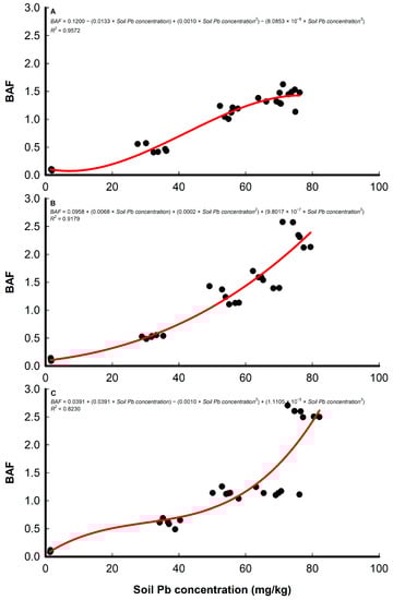 Scatter plot of Pb’s bioaccumulation factor (BAF) values in three sorghum cultivars roots concerning their soil concentrations: (A) cultivar 1; (B) cultivar 2; (C) cultivar 3.