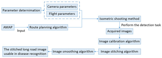 In general, there are many challenges to the practical application of UAVs in the detection of pavement damage. For example, there is a lack of optimal camera parameters and flight parameters for UAVs to perform full-road continuous image acquisition on pavements, a lack of specialized and reliable route planning algorithms and shooting control algorithms for automatic road damage detection by UAV, and a lack of efficient methods for stitching single images of pavements into a long road image to perform machine learning to identify road damage. As a reference for solving the above problems, the aim of this paper is to determine the optimal camera and flight parameters of a UAV during road image acquisition, and to propose a flight planning control algorithm and image stitching processing method from the demand of UAV road damage detection tasks.