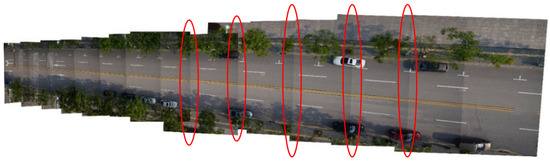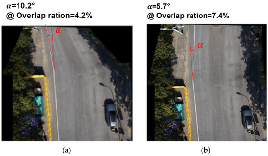 The images collected by the UAV are continuous single images, which need to be stitched to form a complete long image of the pavement. If the image overlap ratio is too low while the images are being stitched together, this will affect the accuracy of the matching algorithm and will thus cause distortion in the final image. Figure 2 shows that, when the overlap ratio is low, a large offset angle () may be caused in the stitched image. On the other hand, an excessively demanding image overlap rate will occupy too much memory resources and increase the calculation cost.
