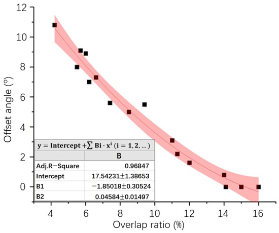 To obtain an optimal overlap ratio, one that guarantees the quality of the stitched image while incurring the lowest possible calculation cost, and thus further calculate the optimal shooting interval distance, a series of image stitching experiments were conducted in this study. The relationship between the overlap ratio and the offset angle of the stitched image is shown in Figure 3: