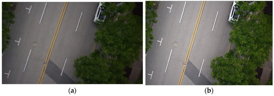 A shorter shutter time usually leads to a lower image brightness, as shown in Figure 4 where the brightness of the image whose shutter speed was 1/1200 s is significantly lower than that of the image whose shutter speed was 1/800 s. In general, the shutter speed of 1/800 s can ensure both the sufficient brightness and clarity of most urban road and highway images, so the shutter speed adopted in this study is 1/800 s.