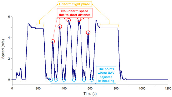 The Callbacks function provided by the DJI client can be used to read the speed information of the UAV, as shown in Figure 7. In the flight process, at the beginning of each flight segment the UAV adjusts its heading so as to face the best direction in which to fly toward the end point from the starting point (which is the end point of the previous flight segment), and then accelerates to the end point (which is the starting point of the next flight segment) of the current flight segment. In the process of flight, the UAV first accelerates to the optimal speed, then flies at a constant speed, and slows down to 0 continuously when approaching the end point. When the flight segment is not long enough, there would be no constant speed flight process (as is shown in the red circles in Figure 7). The speed of the UAV is therefore not constant when flying along a curved road, indicating that the equal distance shooting mode, rather than the equal time interval shooting mode, should be adopted when taking pictures in UAV road continuous image acquisition tasks.