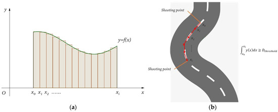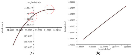 The raster method is usually used to model the traffic network in the road database. The raster cuts the road into several small segments, with each segment regarded as two nodes and a line in the algorithm. When the UAV flies along the actual road, some sections of the road will be less curved than others, therefore requiring less nodes, as is shown in Figure 6. Therefore, a specific strategy [38] to omit those unnecessary nodes has been adopted in this paper to maintain the scale of the Dijkstra algorithm and to reduce the time and memory cost.