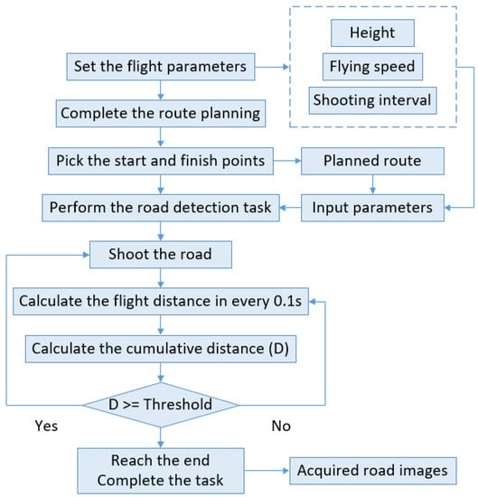 In order to ensure that the UAV flies strictly over the detected road, and to ensure that the image quality obtained by the UAV satisfies the requirements of pavement disease detection, this framework requires two steps before the UAV takes off. The first of these is to determine the best flight parameters and camera parameters, including pixel values, flight altitude, shooting interval, shutter speed, flight speed, etc. Secondly, it is necessary to obtain a positive-weighted directed graph by AMAP and input it into the route planning algorithm to control the flight route of the UAV. After the UAV takes off, because each image taken by the UAV during flight has the same size, it is necessary to shoot images at the same distance along the detected road so as to effectively cover all the detected road sections. An isometric shooting algorithm is then developed and adopted to realize the isometric shooting in the framework.