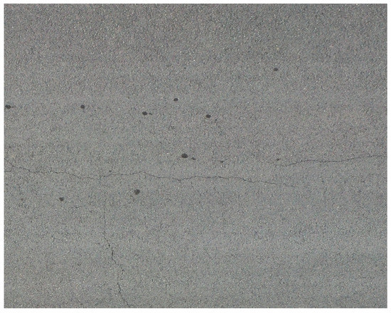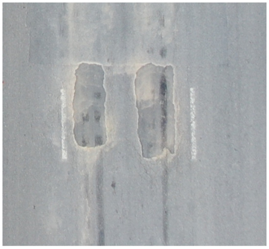 The aim of this study is to provide a feasible image acquisition method for UAV pavement disease detection, so it is necessary to make sure that the aerial pavement long images acquired by the above algorithm can be applied to machine learning for pavement disease identification. A prerequisite for the successful use of the stitched image so that machine learning can be used to identify cracks is that the pavement cracks in the stitched image can be clearly displayed. Zooming in and observing Figure 27, four crack damage areas can be clearly identified, as is shown in Figure 28.