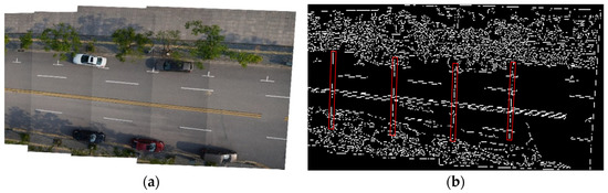 The stitched images without smoothing process will greatly affect the extraction of disease objects in the Canny operator due to the uneven brightness at the junction, as is shown in Figure 29. In Figure 29b, due to the uneven brightness around them, the stitching seams were also extracted by the Canny operator into the edge detection result, which could be easily misidentified by machine learning as pavement transverse cracks. In order to test whether the stitched images after the smoothing process in this paper would still have an effect on the extraction of disease objects, the extraction of disease objects by Canny was conducted on the stitched images after the smoothing process, as shown in Figure 30. After the smoothing process, the stitching seams were no longer extracted by the Canny operator as edges, while the cracks on the road surface were still successfully extracted. This means that the long road stitched image obtained by the image stitching and smoothing method in this paper can be applied for machine learning recognition and evaluation of pavement distress, and that the UAV road surface image continuous acquisition method developed in this paper is valid and can be applied in the future practical application of UAV pavement disease detection tasks.