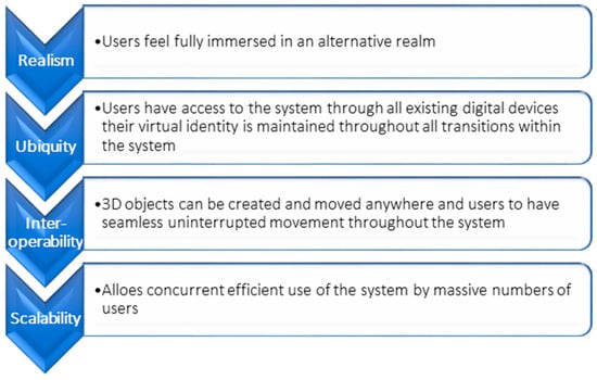 Given its extreme complexity and novelty, the enormous potential of the metaverse is not yet fully realized [,,,]. Dionisio et al. [] point out four characteristics deemed fundamental elements for a fully realized metaverse (Figure 1).