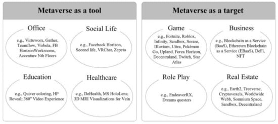 Dwivedi et al. [] divide the applications of the metaverse into two categories: (1) the metaverse as a tool, i.e., in cases where the metaverse is used to solve situations in the real, physical world; and (2) the metaverse as a target, i.e., how the metaverse can be used to develop and generate profits, among other things (Figure 4).