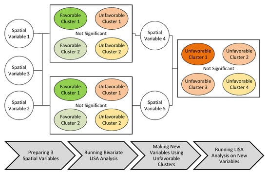 Suppose we have two sets of LISA clusters, the first one on variable 1 and variable 2, e.g., elderly population and PT, and the second one on variable 1 and variable 3, e.g., elderly population and healthcare. From each set, we take the clusters that indicate unfavorable inequities, e.g., “high elderly and low PT” and “low elderly and low PT”, and their local Moran’s I indices. These indices are then used as the degree of inequity, where negative values (for high elderly and low PT) indicate high inequity and positive values (for low elderly and low PT) indicate low inequity. The degree of inequity for other regions is effectively put to zero. This provides us with two new spatial variables which designate the degree of inequity in two urban amenities for the same disadvantaged cohort. The next step is to run the third LISA analysis on these new variables. The results reveal the clusters of simultaneous inequity in the variables of interest. This process is illustrated in Figure 1.