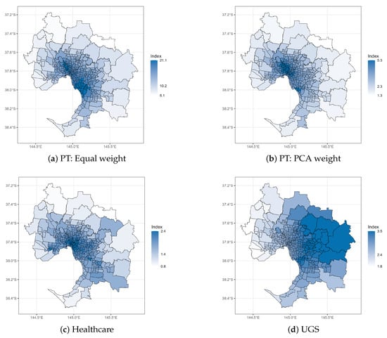These study variables were combined in a gravity model to give a summarized overview of the distribution of PT and other urban amenities, including healthcare and UGS. The summary of the obtained indices is presented in Table 1 and their spatial distributions are visualized in Figure 2. Focusing on PT, the central suburbs, those closer to the central business district (CBD), have better PT accessibility, as expected. The equal-weighted and PCA-weighted methods do not show significant differences at the overall level but for the southeastern suburbs, the latter is lower in comparison to the former, which seems more realistic. The summary of the PCA analysis that yields the latter index is presented in the Appendix A, Table A1. The distribution of healthcare facilities shows a similar pattern to PT, and possibly to other urban amenities, in terms of its concentration around the CBD. However, UGS has a distinct distribution, with its accessibility diminishing from east to west.