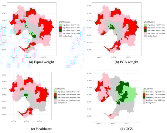 It should also be noted that as PT inequity is the focus of this study and our main aim is to analyze simultaneous inequity, we kept our LISA clusters fixed (obtained from LISA on the elderly population and PCA-Weighted PT) when running the Mann–Whitney U test for healthcare and UGS. This is discussed further in Section 4.