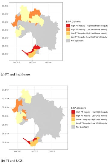 In the last step, to shed light on the areas suffering from multiple inequities and, hence, needing the most attention, we performed a LISA-on-LISA analysis. The results are illustrated in Figure 4. Section (a) is on the simultaneous inequity between PT and healthcare. As visualized, the outer northern suburbs and some in the far south are suffering from inequity in both the studied variables, although to different degrees. All four clusters obtained here are unfavorable and probably need intervention—this is one major contrast to the LISA analysis, in which we have both favorable and unfavorable clusters. In section (b), the focus is on PT and UGS. In line with the Mann–Whitney U test results, which can be seen in Table 2, there are fewer regions with this type of simultaneous inequity. Some regions in the outer west and some in the far south are suffering from simultaneous inequity.