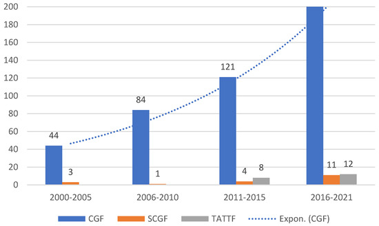 The Scopus database tracked 492 contributions for the search criterion CGF (Corporate Governance and Fraud), 21 contributions for the search criterion SCGF (Sustainable Corporate Governance and Fraud), and 22 contributions for the search criterion TATTF (Tone at the Top and Fraud). Figure 1 shows the evolution of the number of contributions on the three approaches, showing an increasing trend over time with a notable increase since the beginning of the 2000s for the criterion “Corporate Governance and Fraud”. The bibliometric analysis of the data tracks the evolution of the topics over time, offers a network map of the main keywords adopting the VOSviewer software, and classifies the countries of publication and representation by subject.
