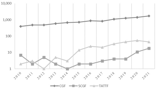 Number of citations of scientific papers on the topics Corporate Governance and Fraud (CGF), Sustainable Corporate Governance and Fraud (SCGF), and Tone at the Top and Fraud (TATTF). Logarithmic scale: Base 10. Source: Own elaboration from Scopus data.