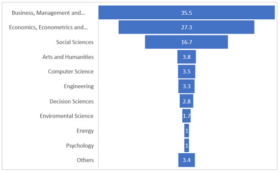 The topic addressed is rather transversal and involves various scientific disciplines. However, as can be seen in Figure 4, the predominant area is linked to the economy, which, overall, represents 62.8% of the total contributions in the sample considered. Within the economic area, contributions related to the topic “Business, Management and Accounting” represent the majority, with 35.5% of the total. Even in the study of social sciences, the topics considered play an important role, and the contributions account for 16.7%. The contributions regarding the human sciences “Arts and Humanities” account for 3.8%, while there are disparate contributions involving different topics, which together account for only over 16% of the total contributions on the topic.