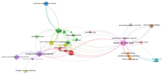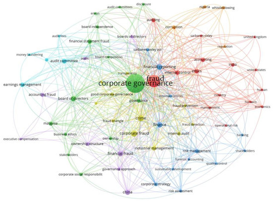 To identify the main links between corporate governance and fraud that have been most investigated by the literature, a keyword-based network analysis was conducted. The analysis was developed with VOSviewer software [66,67]. This software is a suitable and reliable tool for building and visualizing networks and clusters derived from bibliometric analysis. Networks elaborated on the basis of the keywords of the contributions considered in this work are presented below. The method chosen to proceed with the analysis is the so-called “complete counting method”, which gives the same weight to each co-occurrence link between the keywords without the use of fractional units.