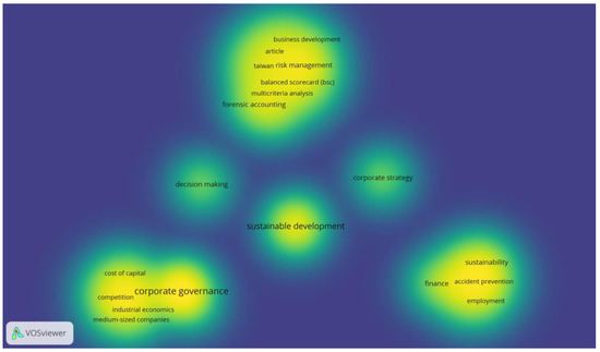 The network density analysis identified the clusters of groups of keywords that contribute most frequently to the subject researched, highlighting the connections among the topics. In the network density analysis in Figure 6, “the larger the number of items in the neighborhood of a point and the higher the weights of the neighboring items, the closer the color of the point is to yellow. The other way around, the smaller the number of items in the neighborhood of a point and the lower the weights of the neighboring items, the closer the color of the point is to blue” [67]. It can be noted that the combination of sustainability development and corporate governance in fraud prevention does not have many connections demonstrated by the literature. Sustainability shows no links with other clusters in the network.